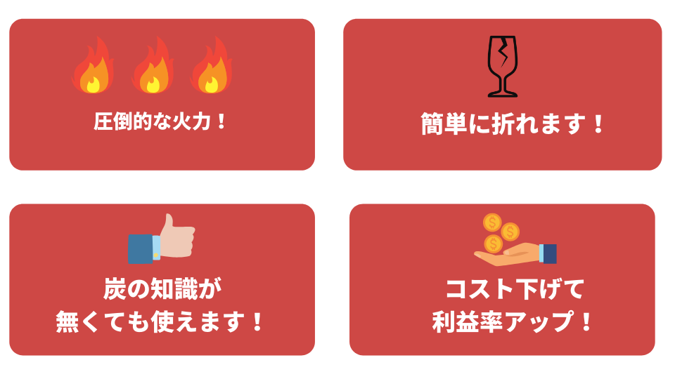 炭が圧倒的に安いので、店舗様の利益率をアップできます。燃料なので、なるべくお安い炭を使い経費削減につなげてください。