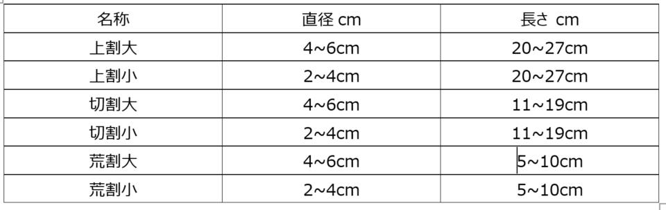 切割の(切)は備長炭の中でも、長さが中くらいのサイズになります。荒割の(荒)は備長炭の中でも、比較的短い商品です。上割の(上)は備長炭の中でも、長さが長いサイズになります。
