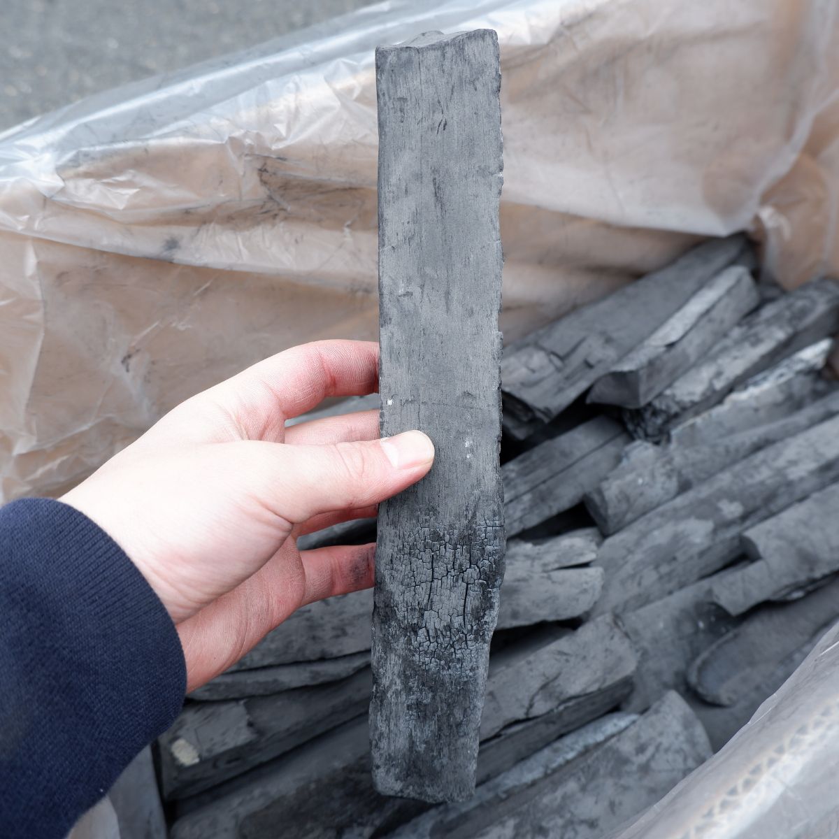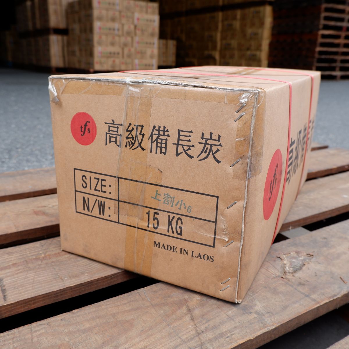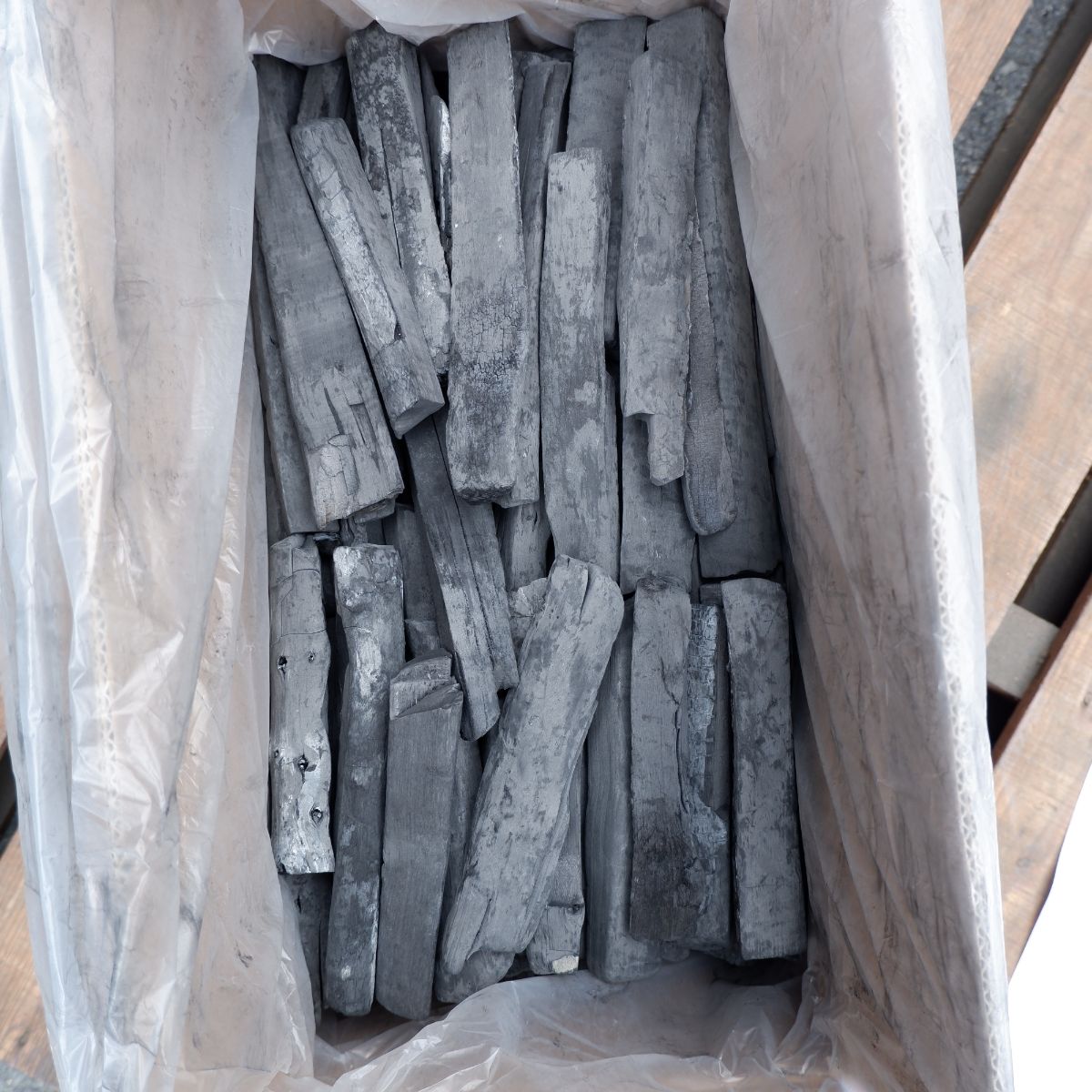 ラオスの備長炭です。上割の(上)は備長炭の中でも、長さが長いサイズになります。上割の(割)は製造の過程で割ったり、割れたりしたものを厳選しています。上割小の(小)は、幅が太いか細いかの違いです。長いので、よく焼き場が長いタイプの焼き鳥屋さんなどにご愛用いただいています。備長炭は火力が強く、油が落ちても炎が出にくいので、食材が焦げるのを防ぎます。さらに、灰もオガ炭に比べると圧倒的に少ないので、安心してご使用いただけます。