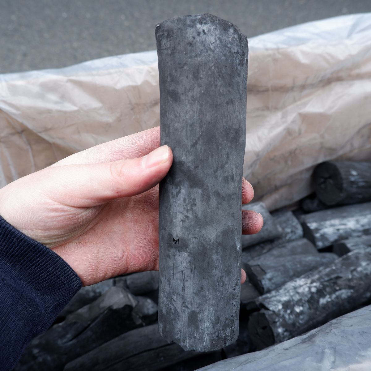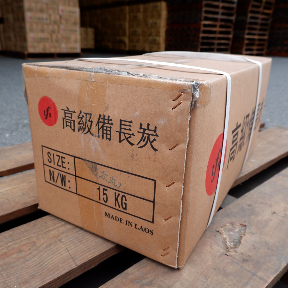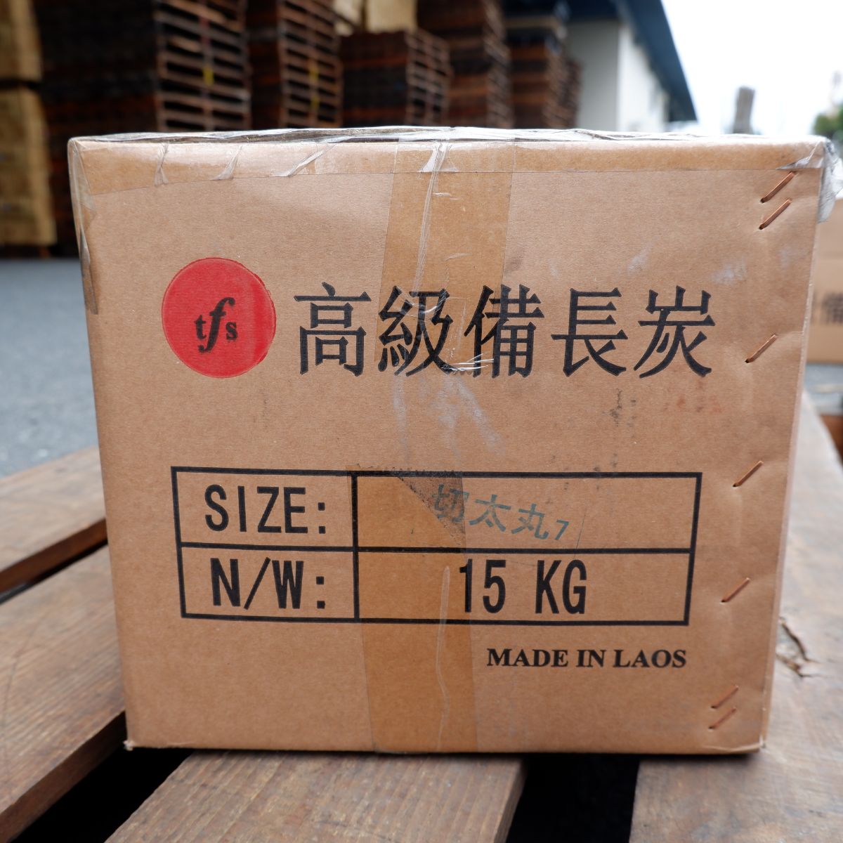 ラオスの備長炭です。切太丸の(切)は備長炭の中でも、長さが中くらいのサイズになります。切太丸の(丸)は、炭が割れたり、割ったものではなく、丸いものを厳選しています。太丸なので、炭の中でも太いタイプになります。丸いので形がきれいで、お客様の前で焼くと喜ばれますよ。備長炭は火力が強く、油が落ちても炎が出にくいので、食材が焦げるのを防ぎます。さらに、灰もオガ炭に比べると圧倒的に少ないので、安心してご使用いただけます。