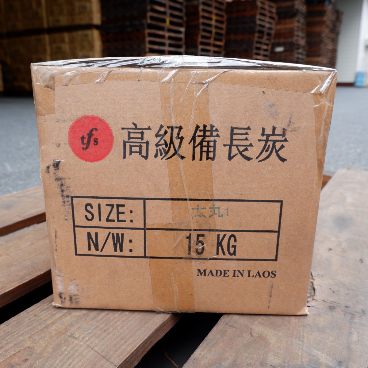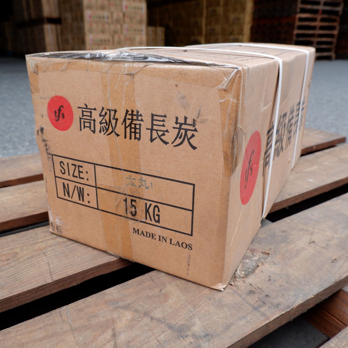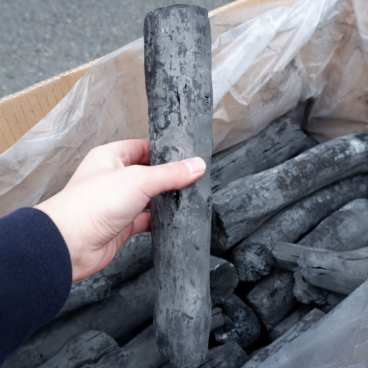 ラオスの備長炭です。太丸は切太丸よりも、長さが長いサイズになります。太丸の(丸)は、炭が割れたり、割ったものではなく、丸いものを厳選しています。太丸なので、炭の中でも太いタイプになります。丸いので形がきれいで、お客様の前で焼くと喜ばれますよ。備長炭は火力が強く、油が落ちても炎が出にくいので、食材が焦げるのを防ぎます。さらに、灰もオガ炭に比べると圧倒的に少ないので、安心してご使用いただけます。